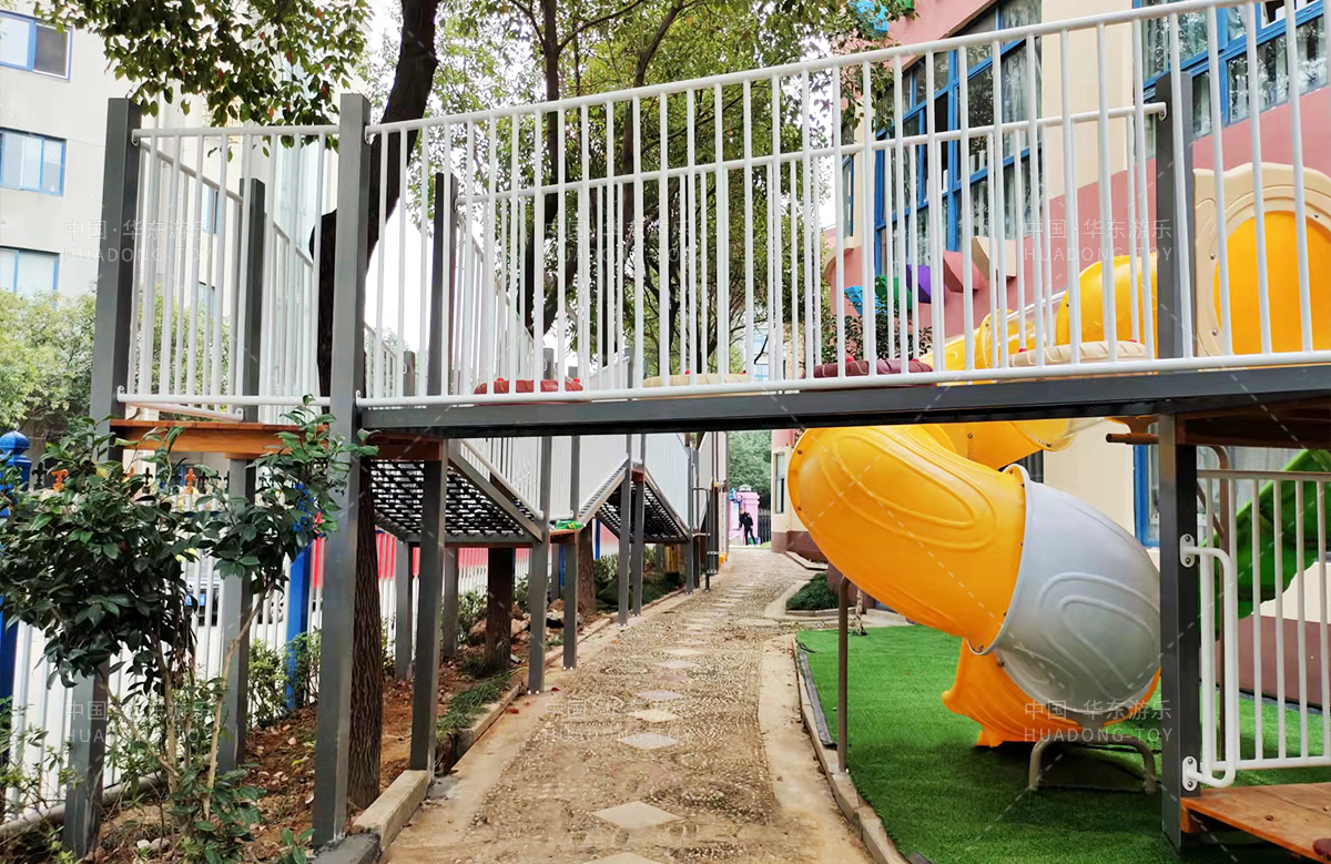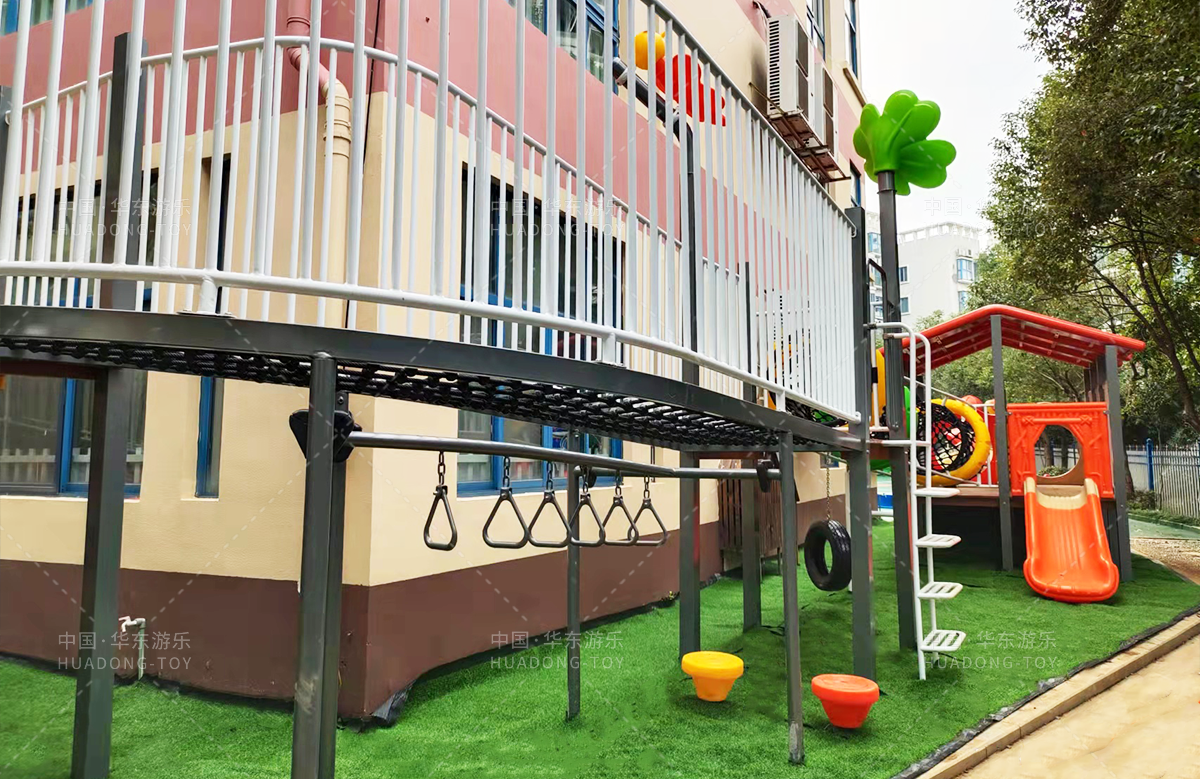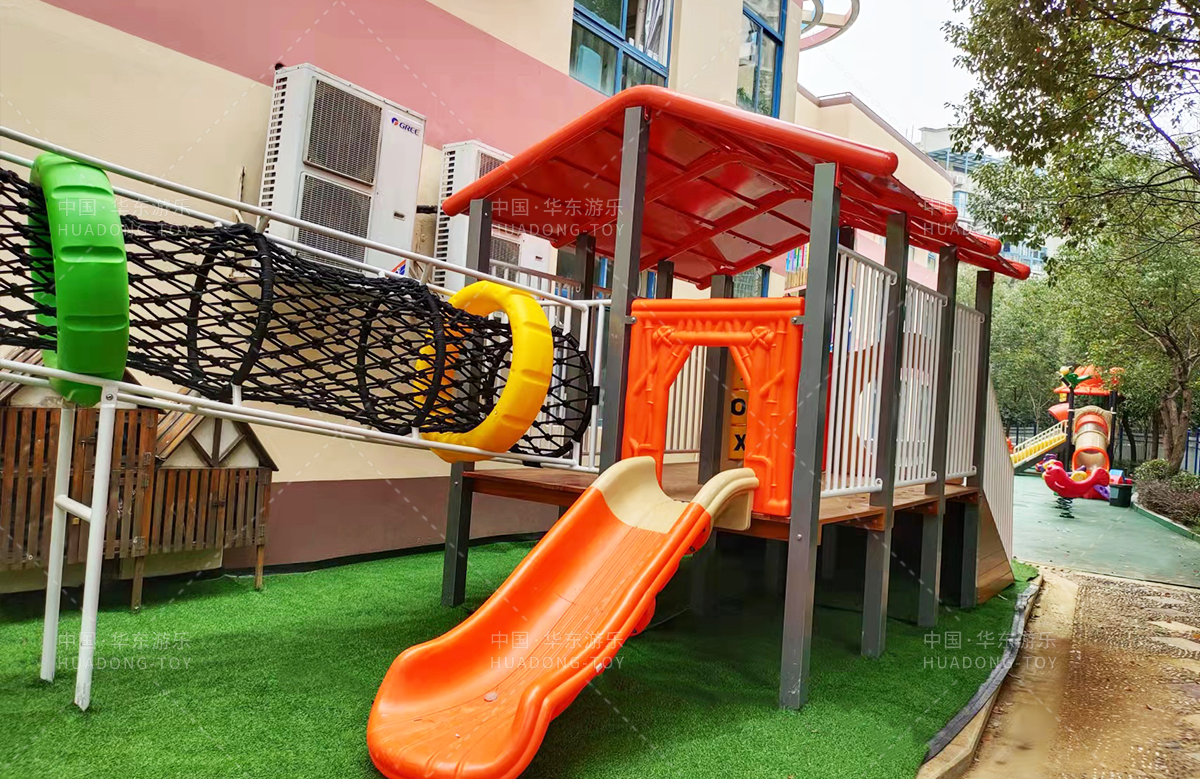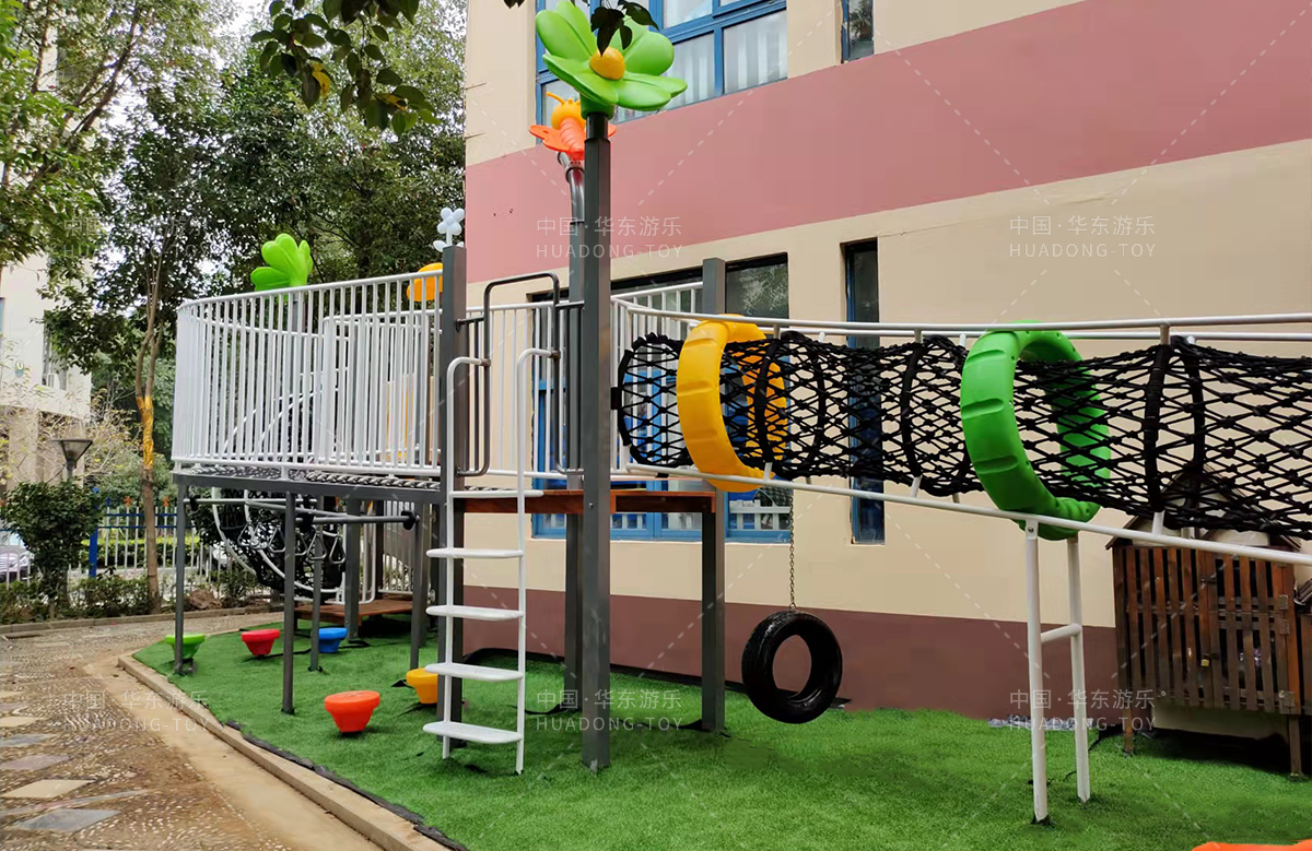 绿都幼儿园选用的是304am永利游乐自主研发的具有攀爬、滑梯、爬网、钻洞、葫芦攀爬为一体的综合性游乐设备。
