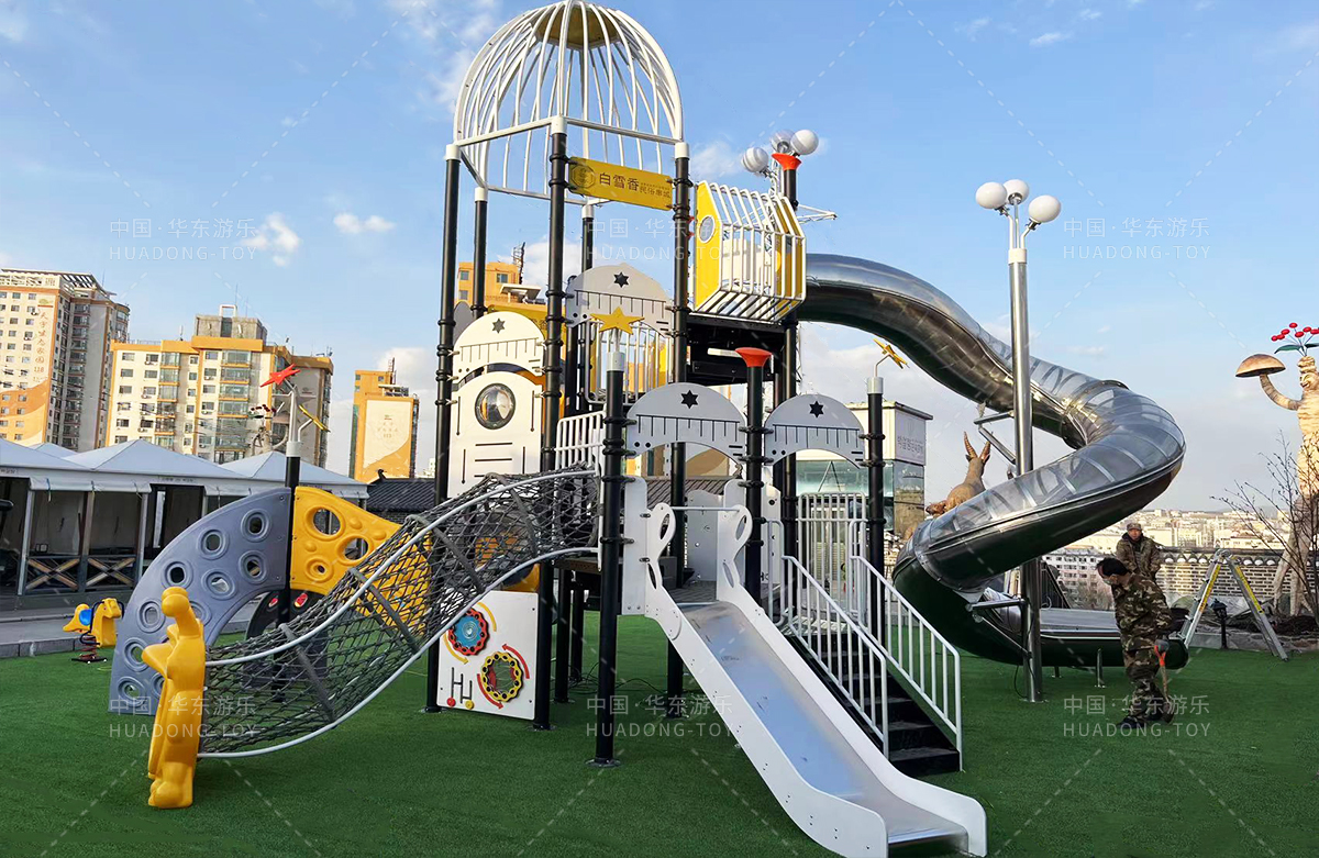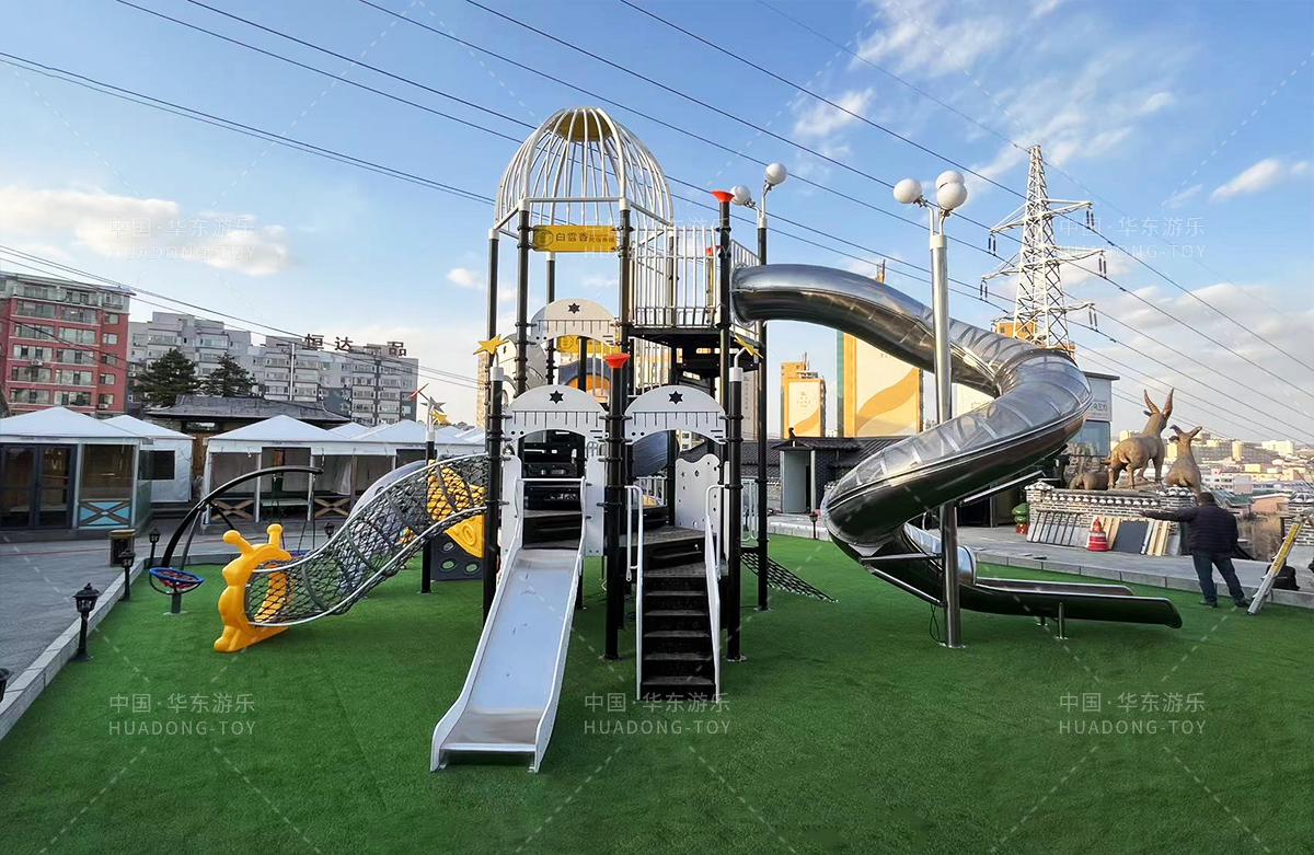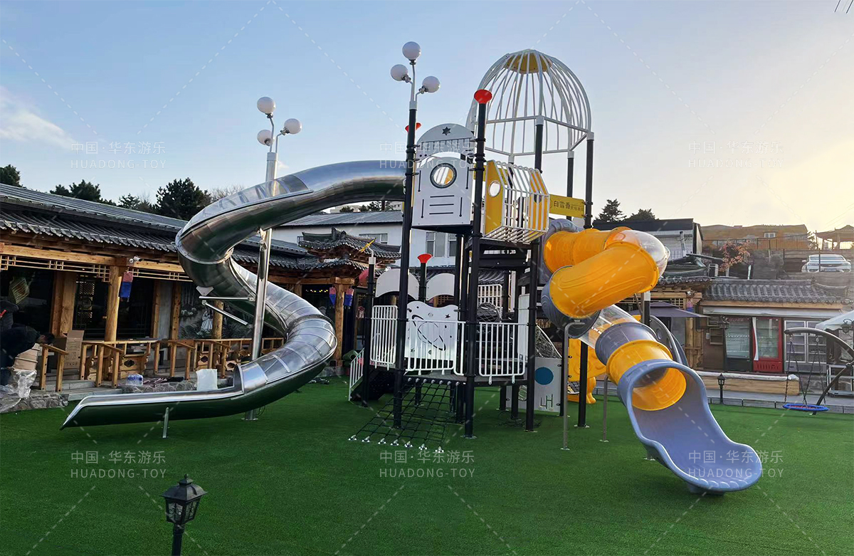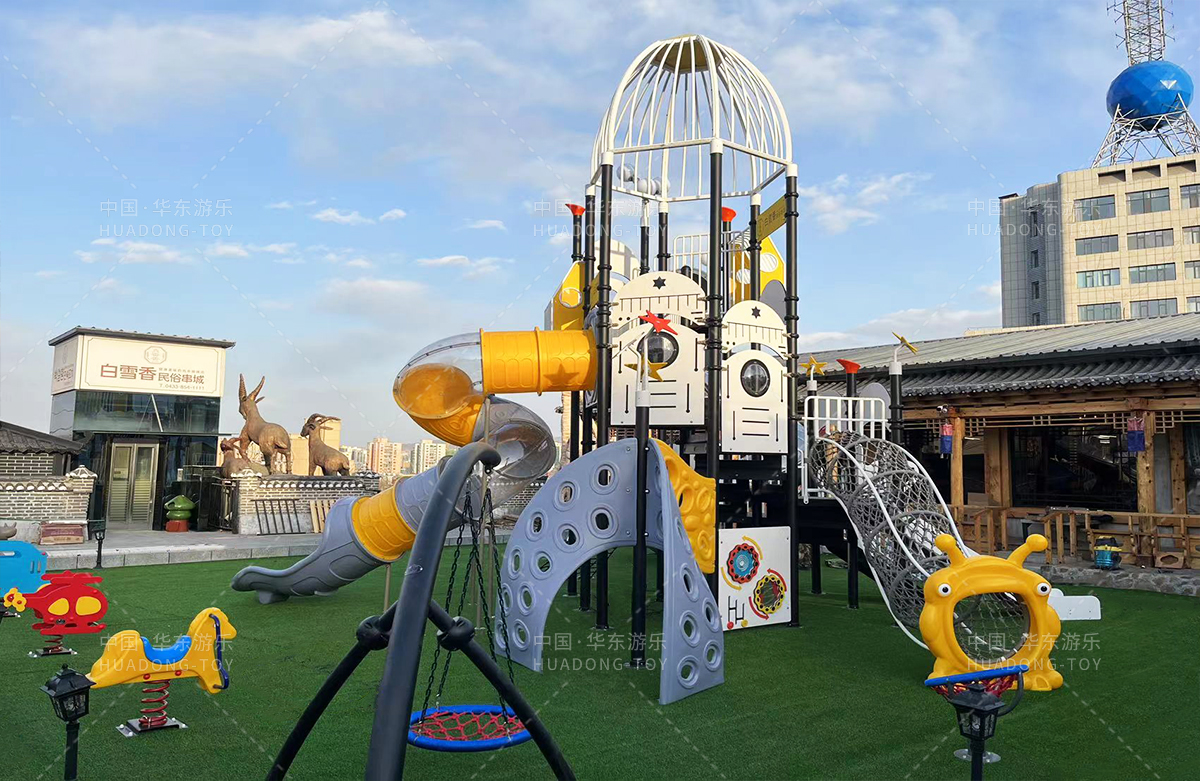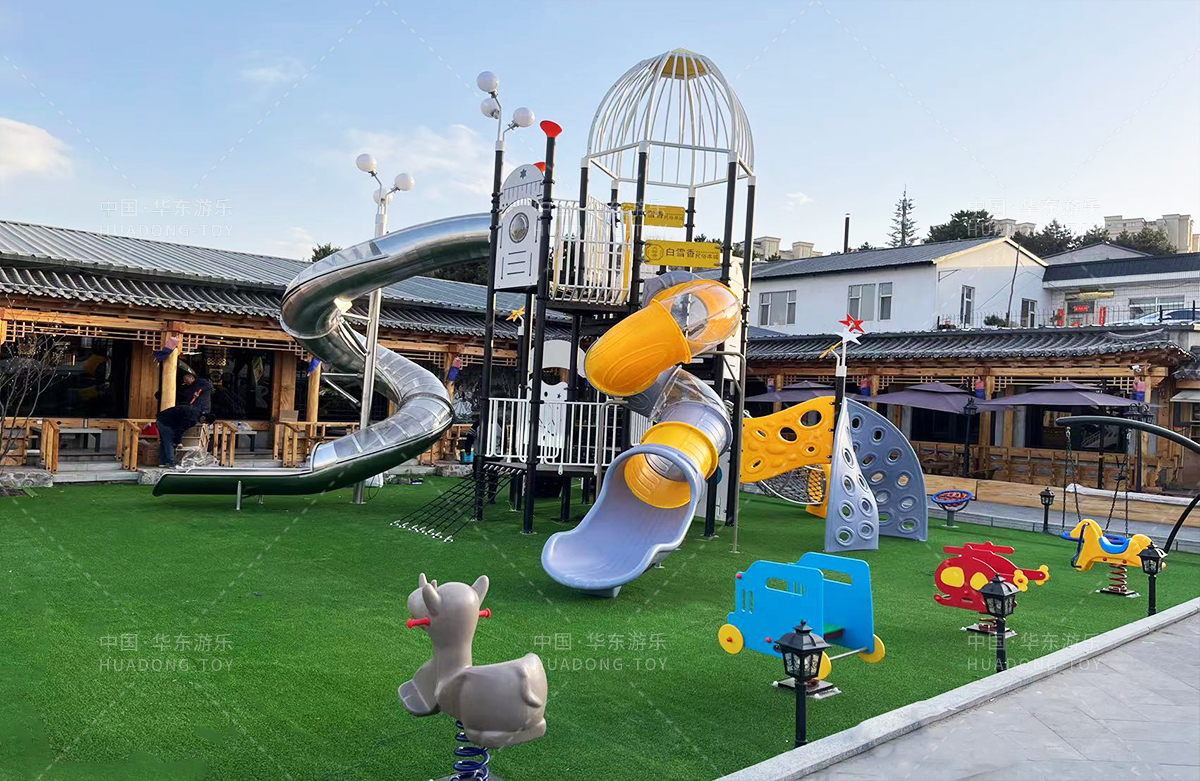 吉林省白雪香民俗烧烤城是一个专业的休闲夜宵烧烤城,此次选用的是304am永利游乐自主研发和设计的 PE板系列滑梯,卡通的造型,齐全的功能深受小朋友们的喜爱,同时还设置了小朋友喜欢的儿童摇摇乐、组合秋千、 旋转碗等游乐设备。