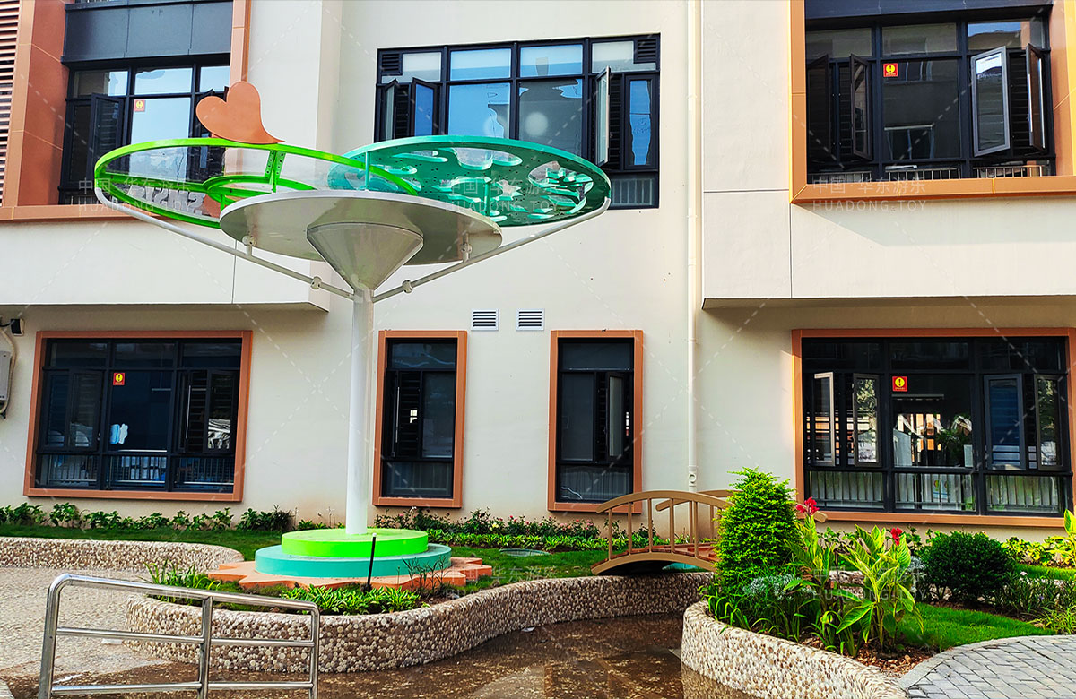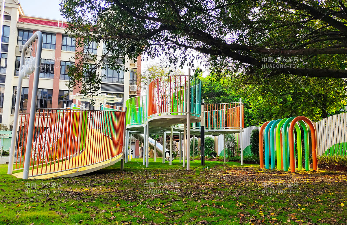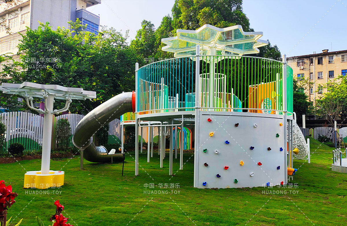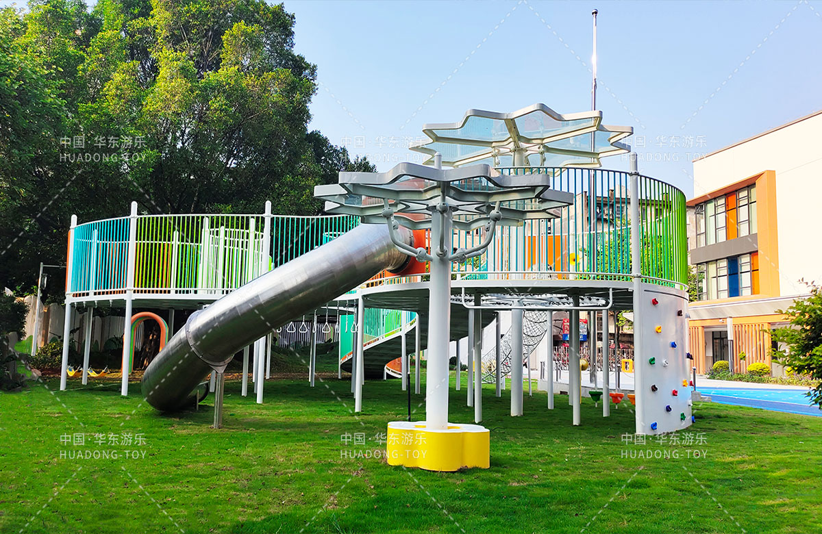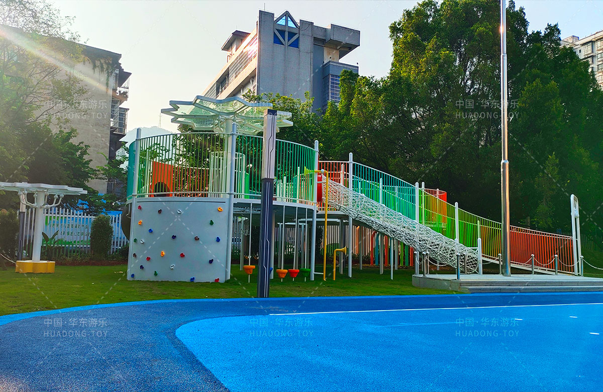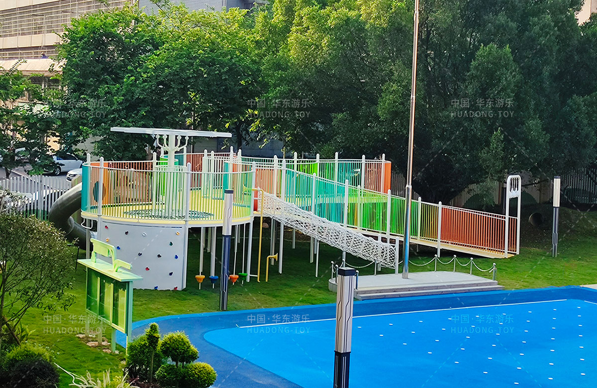 三明市实验幼儿园 选用的是304am永利游乐自主研发和设计的非标定制系列的组合游乐设备,是一款具备了攀爬网、空中网桥、攀爬墙、儿童秋千、大型滑筒、平衡吊环、彩虹桥等功能,除此之外还设置了树形休闲厅、木制小桥等游乐设备,让孩子们有一个健康的成长环境,也为老师的教学提供了保障。