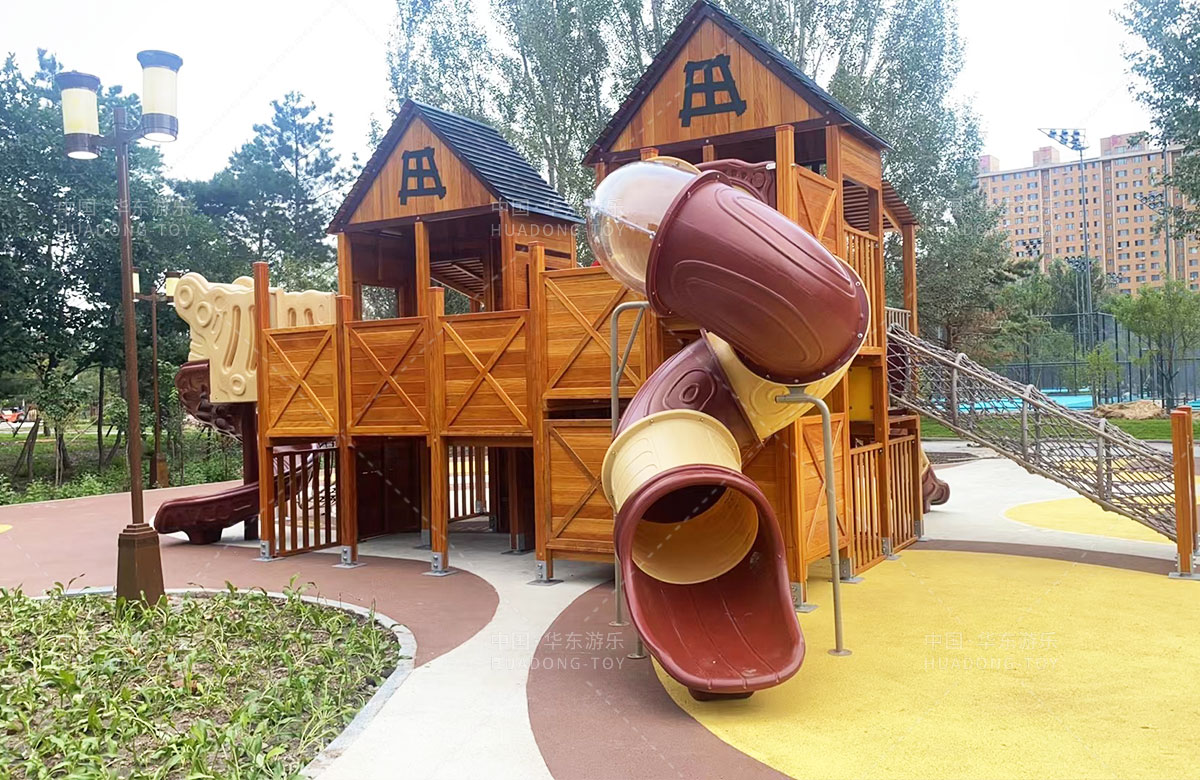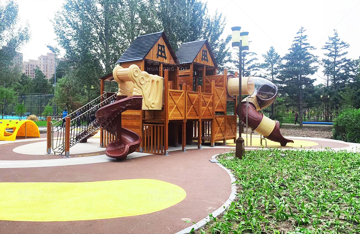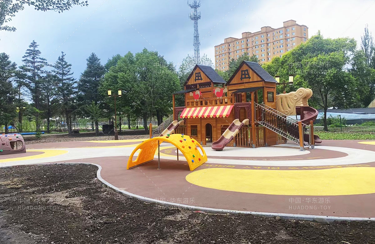吉林省白城市洮北区兵器城小区是一个综合类型的居民小区,该小区设置了各种类型的 游乐设施,为了更好的为人民提供一个休闲娱乐的场所,此次选用的是304am永利游乐自主研发和设计的木质小屋系列的组合滑梯,除此之外还设置了孩子们喜欢的各种攀爬游乐设备。