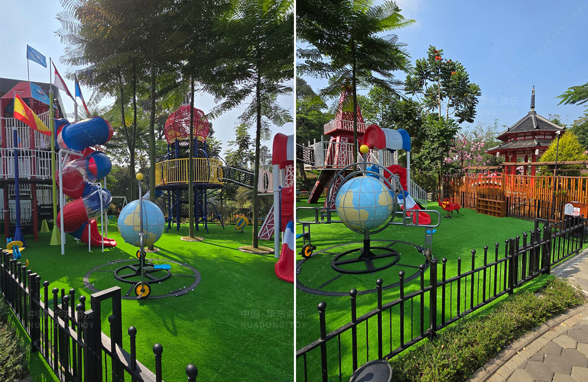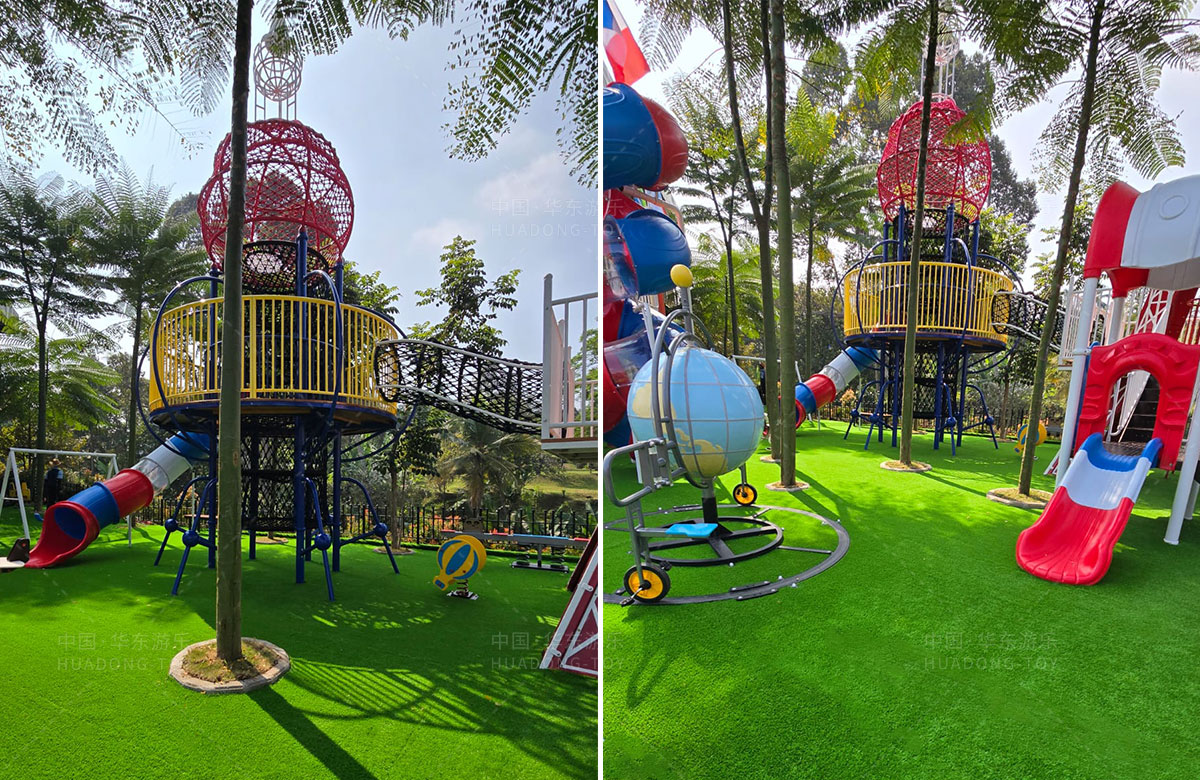 该项目选用的是304am永利游乐自主研发和设计的跨国系列组合滑梯,该滑梯具备了攀爬网、钻洞、滑梯等功能,同时为了让整个游乐场变得更加具有生机与活力,整个项目还设置了小朋友喜欢的儿童摇摇乐、儿童跷跷板、以及地球旋转自行车等游乐设备,为当地的人群体提供了一个休闲娱乐的场所。