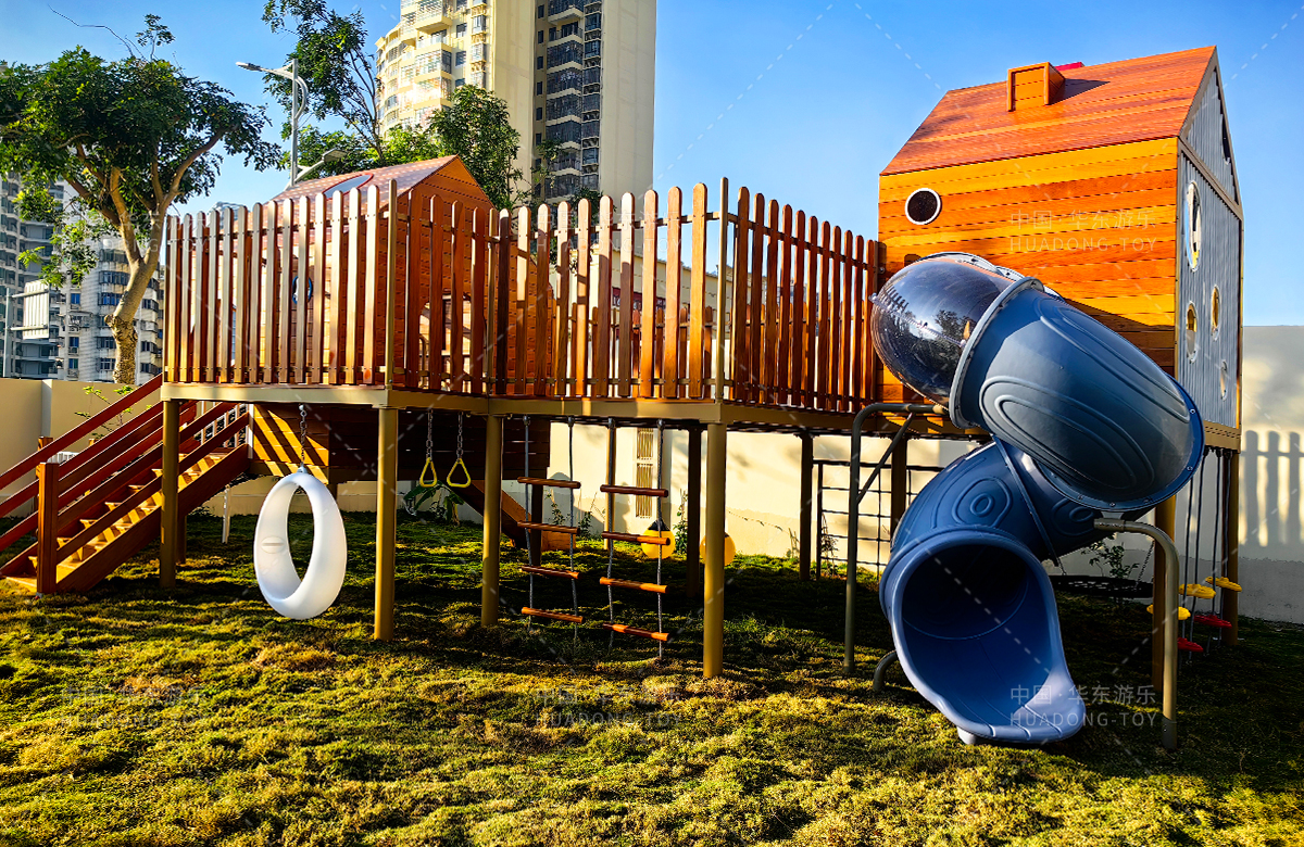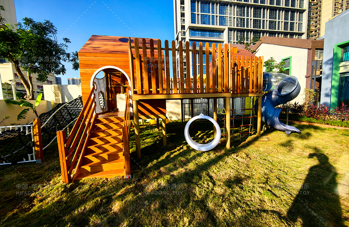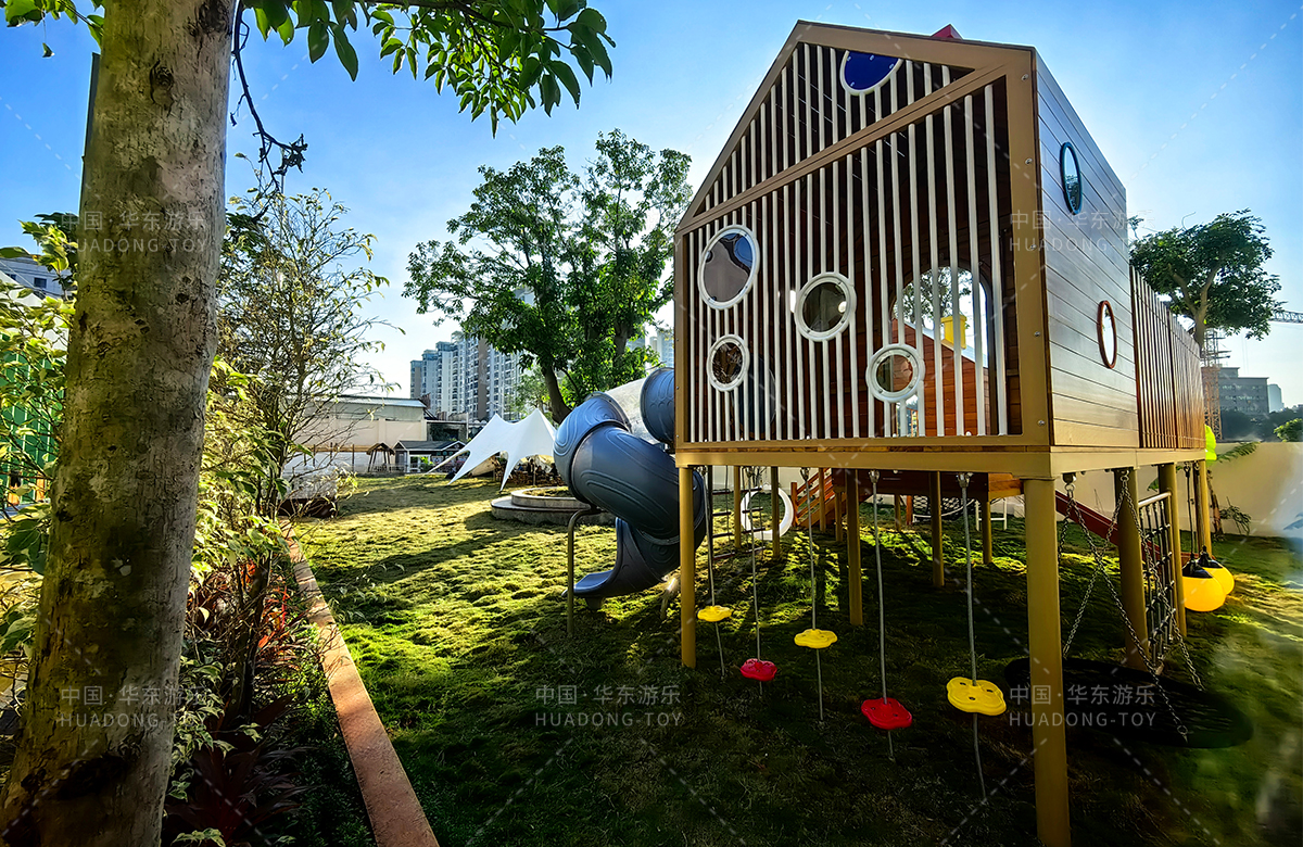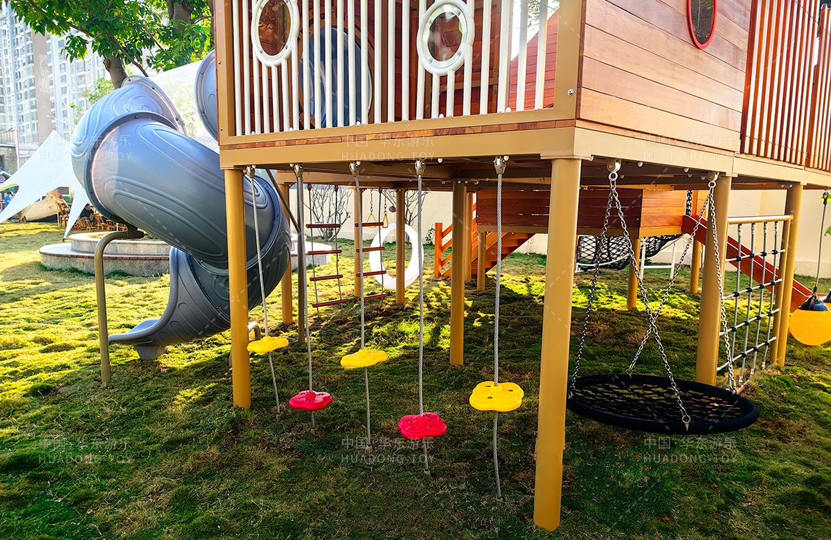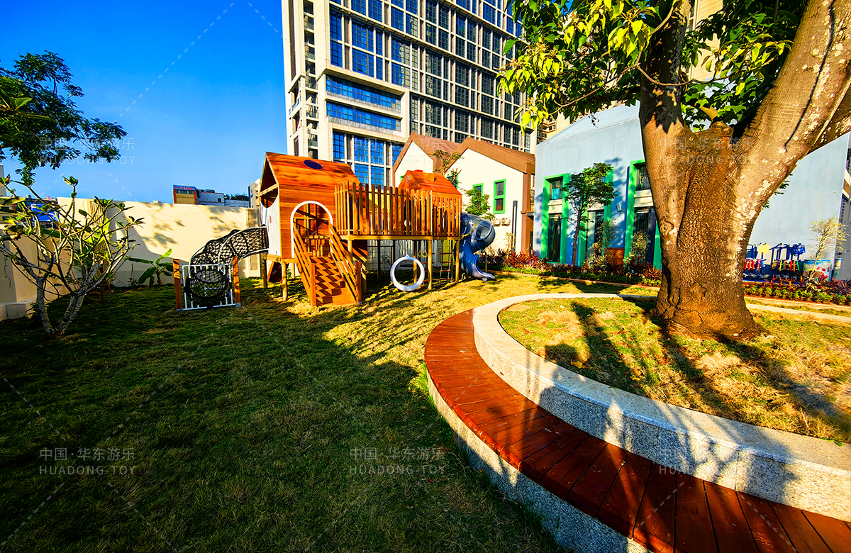 海南省农垦总局机关幼儿园选用的是304am永利游乐自主研发和设计的木质系列非标定制的游乐设备,该游乐设备具备了攀爬网、攀爬梯、月亮秋千、旋转滑梯、儿童秋千、平衡绳等功能为一体,该游乐设备的设置不仅仅为孩子们的玩耍提供看保障,更是为老师的教学提供了帮助。